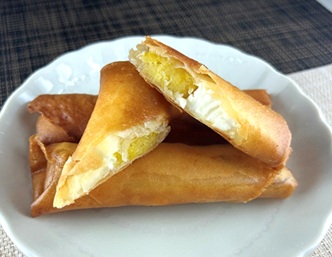 作り方 ①春巻きの皮にさつまいも(お好みでクリームチー ズ)をのせて包み、水溶き片栗粉で止める。 ②180℃の油で、こんがりするまで揚げて完成。